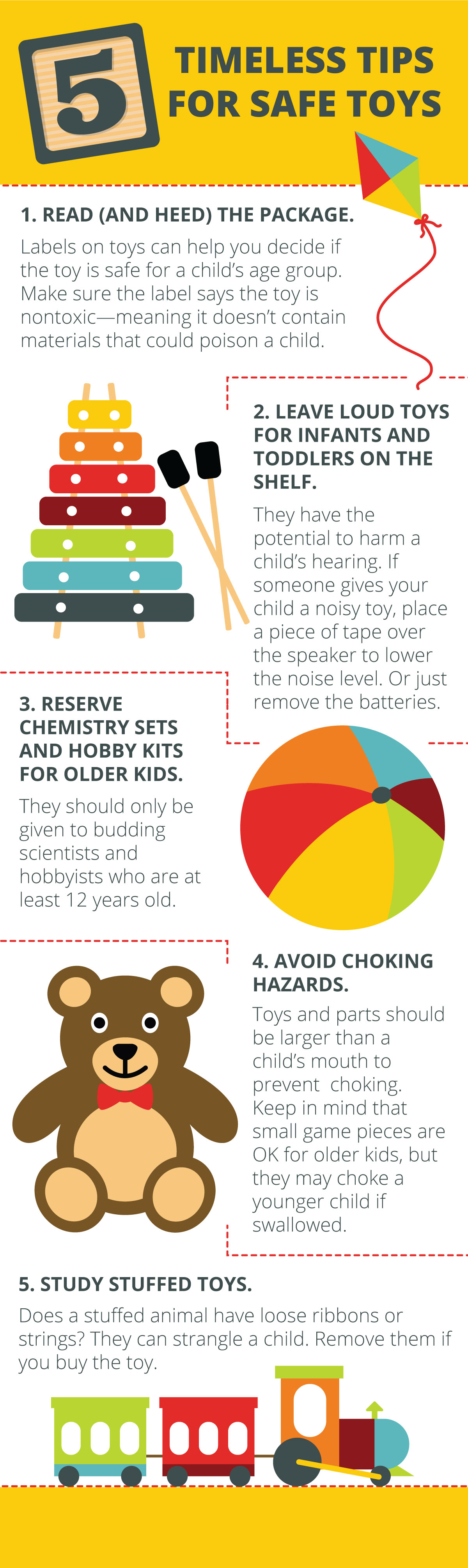 4. Avoid choking hazards. Toys and parts should be larger than a child's mouth to prevent choking. Keep in mind that small game pieces are OK for older kids, but they may choke a younger child if swallowed.